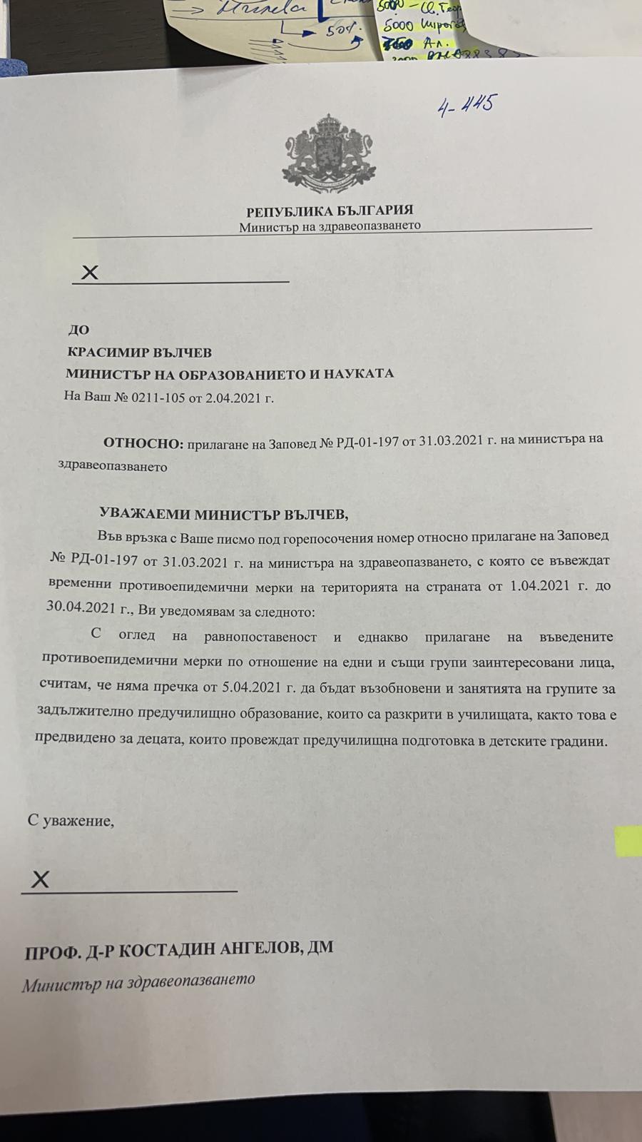 Писмо № 9105-406 от 27.11.2020г. на министъра на образованието и науката